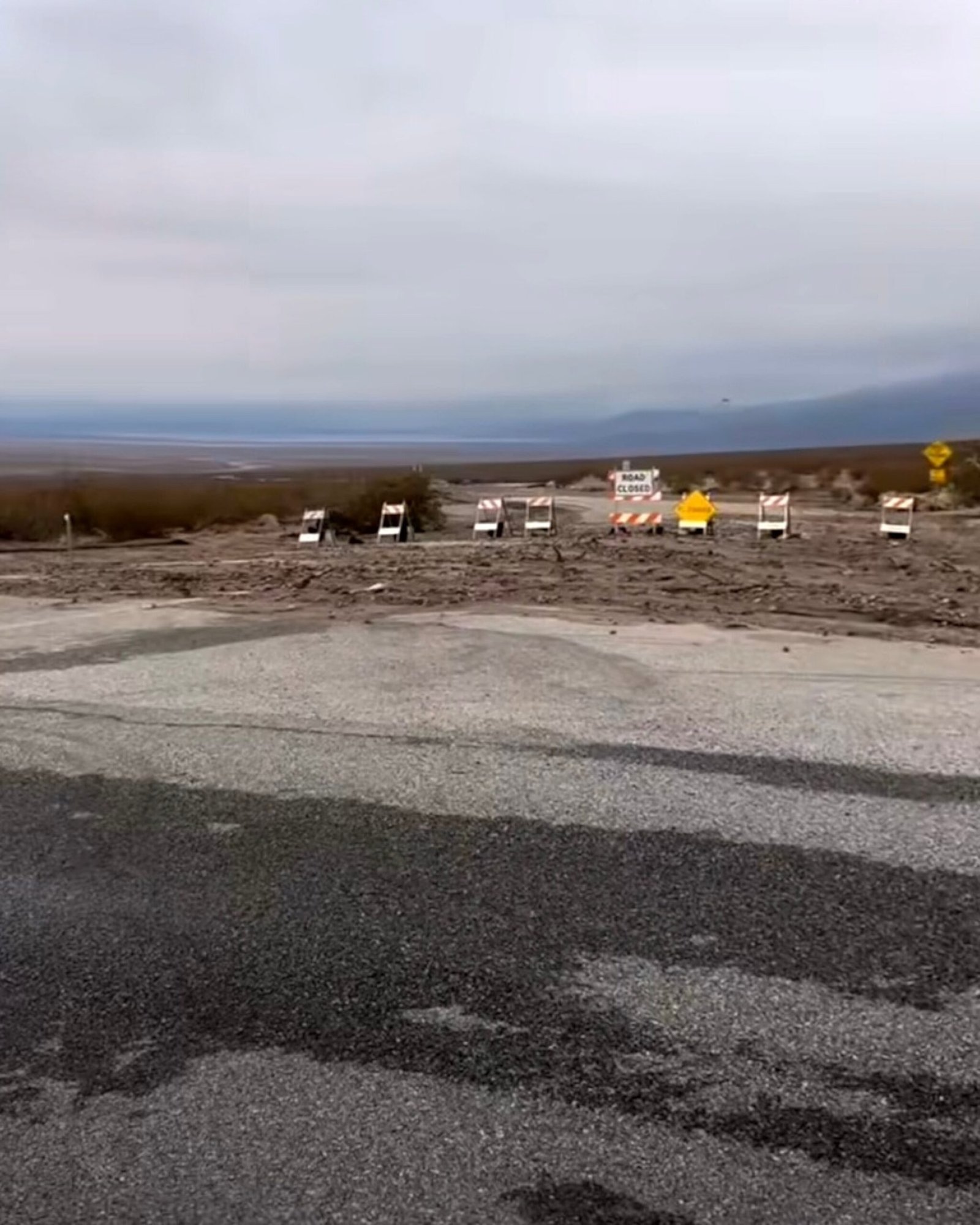 यूएस 395 को बाढ़ के कारण बंद कर दिया गया था, इस स्क्रीन में कैलिफोर्निया हाईवे पैट्रोल – मोजावे द्वारा जारी एक वीडियो से 19 सितंबर, 2025 को।