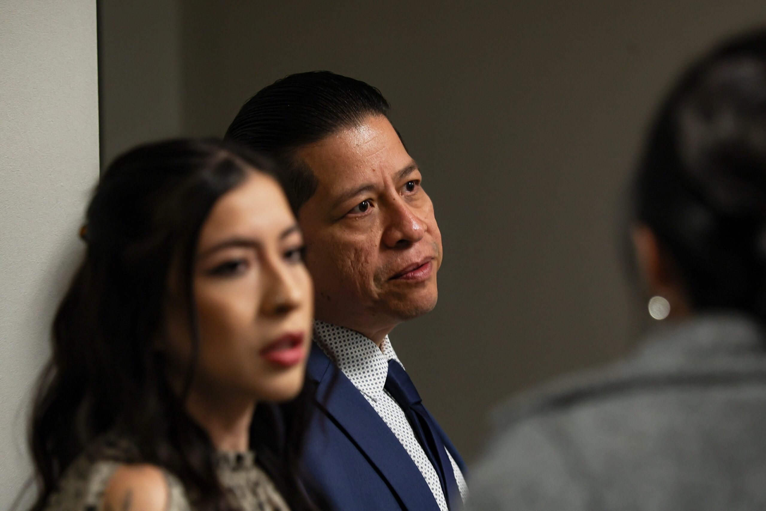 पूर्व उवाल्डे स्कूल जिला पुलिस अधिकारी एड्रियन गोंजालेस, 13 जनवरी, 2026 को टेक्सास के कॉर्पस क्रिस्टी में न्यूसेस काउंटी कोर्टहाउस में अपने मुकदमे के दौरान दोपहर के भोजन के ब्रेक के लिए अदालत कक्ष से बाहर निकलते समय अपने परिवार से बात करते हैं।