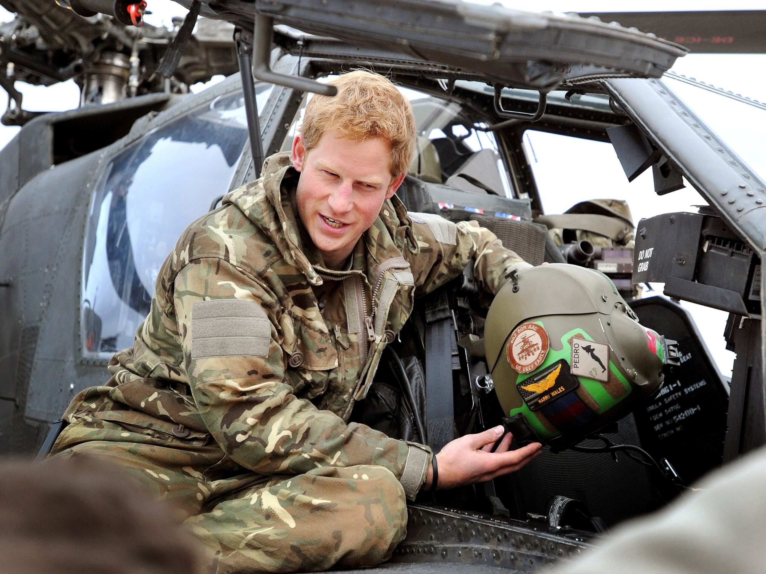 प्रिंस हैरी 31 अक्टूबर, 2012 को अफगानिस्तान में कैंप बैस्टियन में ब्रिटिश नियंत्रित उड़ान-लाइन पर अपाचे हेलीकॉप्टर पायलट/गनर के कॉकपिट की अगली सीट पर बैठे हैं।