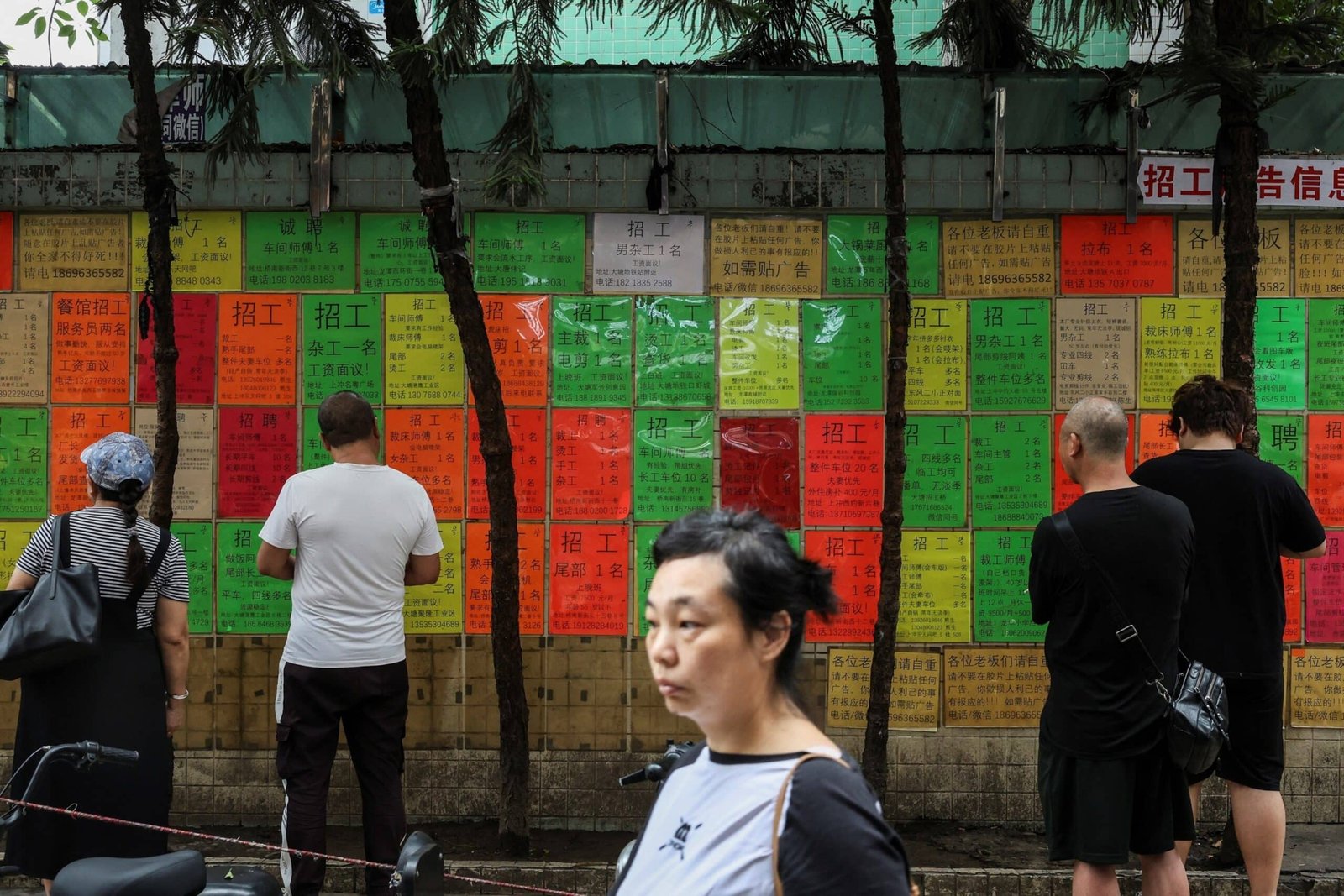 लोग 10 मई, 2025 को चीन, ग्वांगडोंग प्रांत, गुआंगज़ौ, गुआंगज़ौ, गुआंगज़ौ में एक दीवार पर नौकरी के विज्ञापनों को देखते हैं।