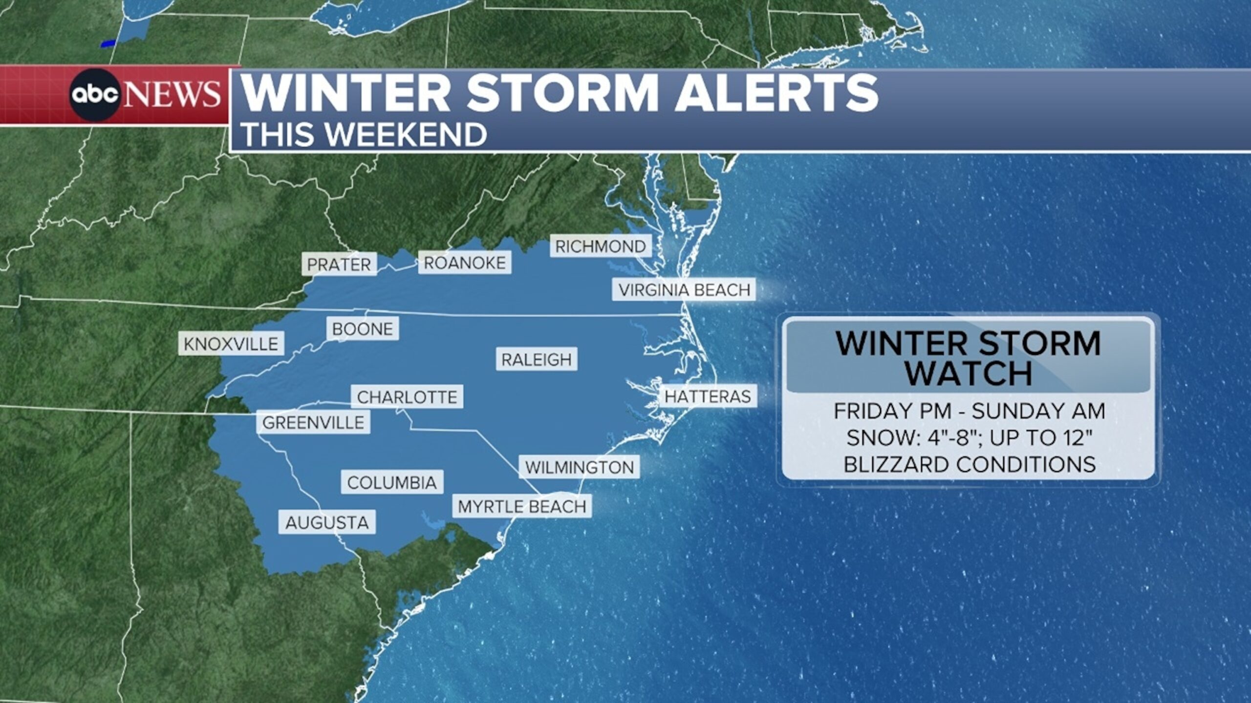 हालांकि अभी भी भविष्यवाणी करना जल्दबाजी होगी एकदम सही कुल मिलाकर, ऐसा प्रतीत होता है कि उत्तरी दक्षिण कैरोलिना, लगभग संपूर्ण उत्तरी कैरोलिना और दक्षिणी वर्जीनिया में बर्फबारी होगी 3 से 8 शुक्रवार रात से रविवार सुबह के बीच इंच बर्फबारी हुई। कुछ क्षेत्रों में 1 फुट तक बर्फबारी हो सकती है, खासकर उत्तरी कैरोलिना तट पर जहां भारी बर्फ लंबे समय तक रह सकती है।