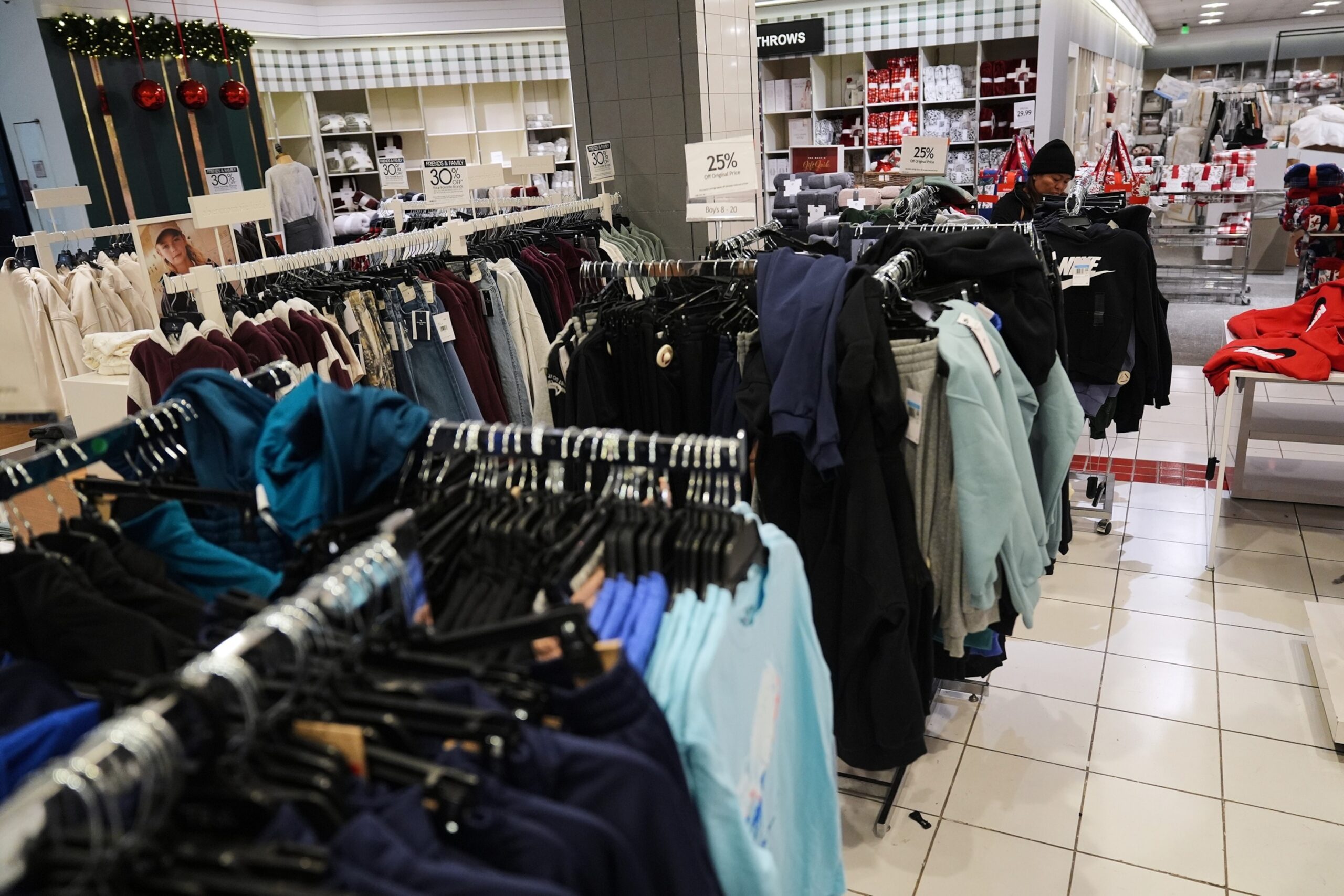 10 दिसंबर, 2025 को टौसन, एमडी में एक व्यक्ति मैसी के डिपार्टमेंट स्टोर के अंदर कपड़ों की रैक ब्राउज़ करता है।