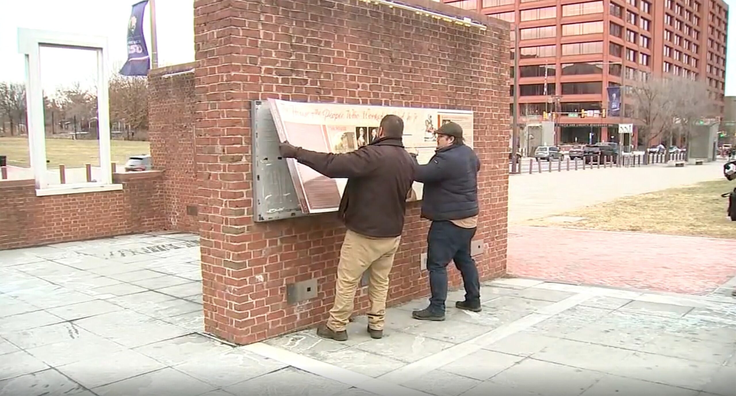 राष्ट्रीय उद्यान सेवा के कर्मचारियों को फिलाडेल्फिया में राष्ट्रपति भवन में “नए राष्ट्र के निर्माण में स्वतंत्रता और दासता” प्रदर्शनी के पैनल हटाते हुए चित्रित किया गया है।