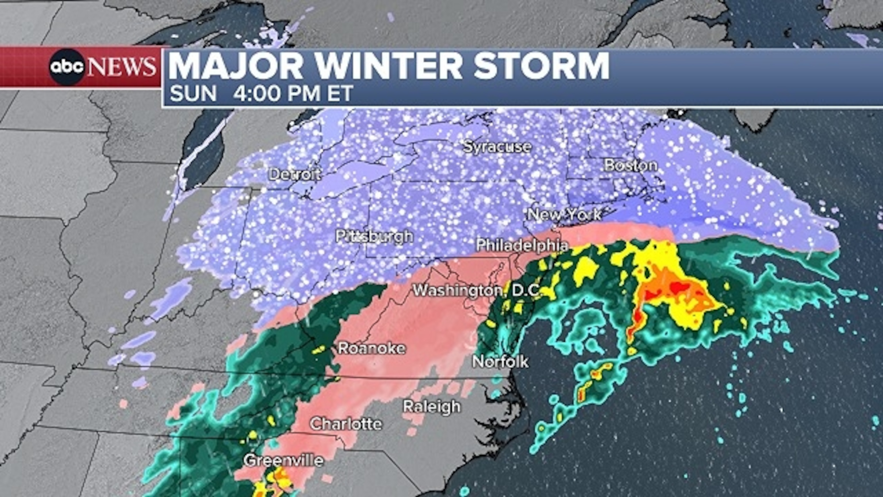 तूफान रविवार तड़के पूर्व की ओर बढ़ेगा, विचिटा, कंसास से सिनसिनाटी, वाशिंगटन, डीसी और फिलाडेल्फिया तक बर्फ लाएगा।