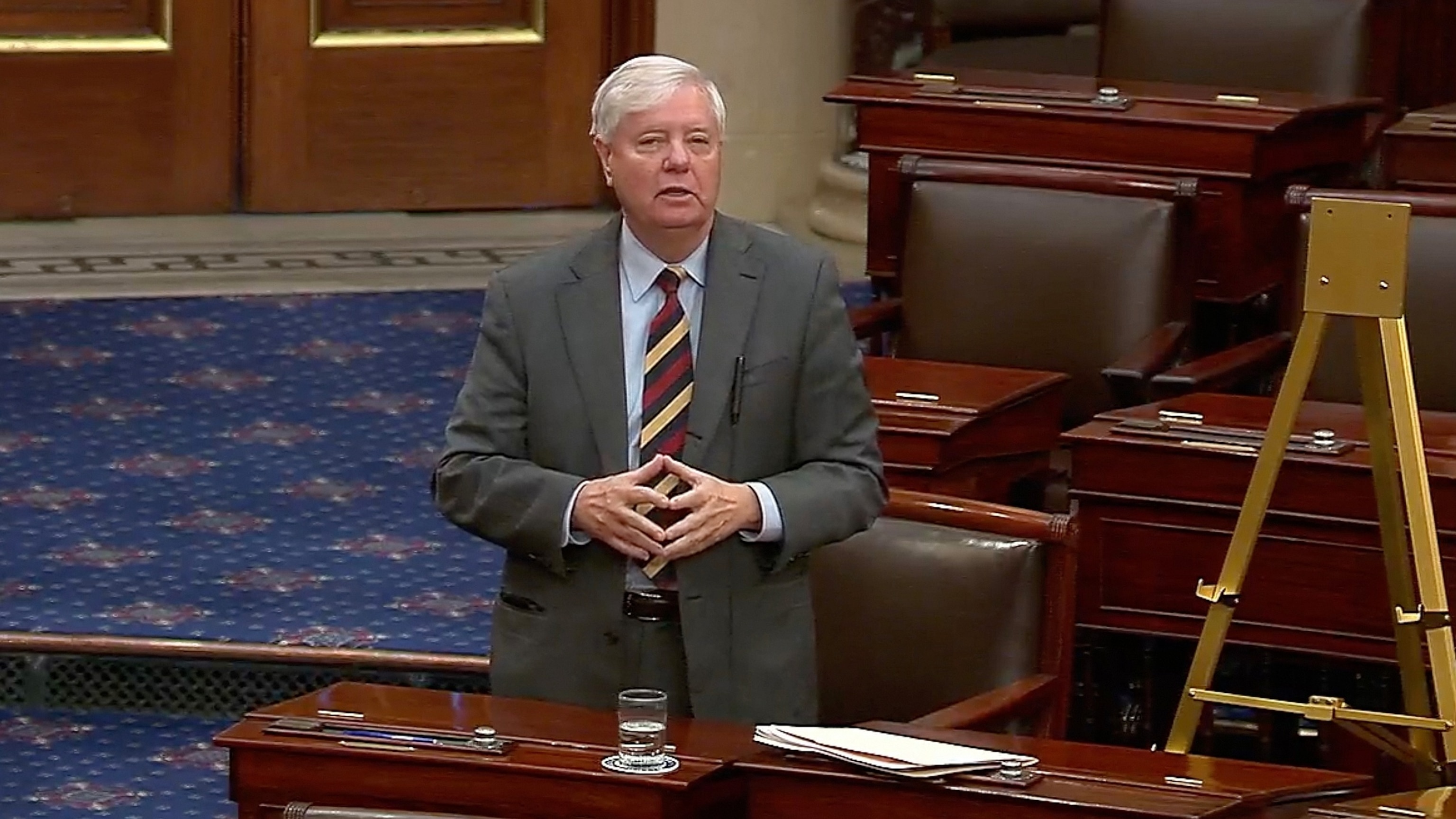 सीनेटर लिंडसे ग्राहम 30 जनवरी, 2026 को वाशिंगटन में सीनेट के पटल पर बोलते हैं।